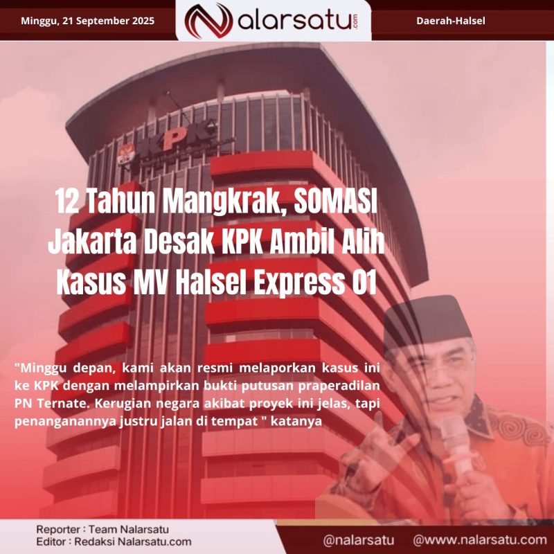 TERNATE, Nalarsatu.com – Kasus dugaan korupsi pengadaan kapal cepat MV Halsel Express 01 kembali mencuat ke permukaan setelah 12 tahun mandek di Kejaksaan Tinggi (Kejati) Maluku Utara. Solidaritas Mahasiswa dan Pemuda Satu Indonesia (SOMASI) Jakarta menegaskan siap melaporkan kasus tersebut ke Komisi Pemberantasan Korupsi (KPK) agar ditangani secara tegas dan transparan.