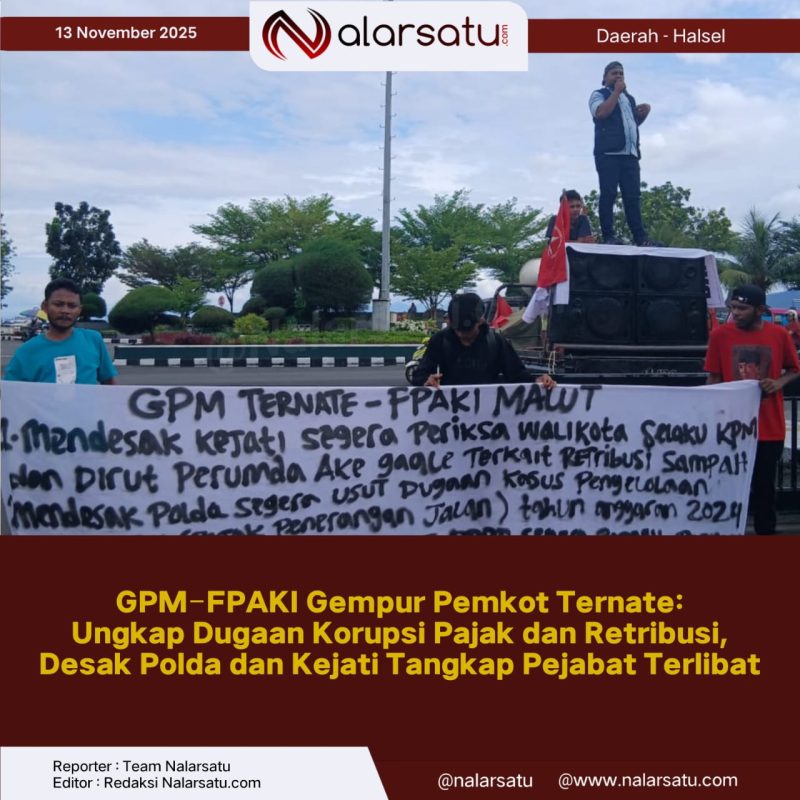 Ternate, Nalarsatu.com – Aksi unjuk rasa Besar di Kota Ternate, Kamis (13/11/2025). Gabungan Gerakan Persatuan Mahasiswa (GPM) Ternate dan Forum Pemuda Anti Korupsi Indonesia (FPAKI) Maluku Utara turun ke jalan menuntut pertanggungjawaban Pemerintah Kota (Pemkot) Ternate atas dugaan kuat penyimpangan pengelolaan Pajak Penerangan Jalan (PPJ) dan Retribusi Sampah yang dinilai telah “mencekik rakyat dan merampas hak publik.”