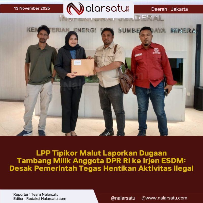 Jakarta, Nalarsatu.com – Lembaga Pengawasan dan Pemberantasan Tindak Pidana Korupsi (LPP-Tipikor) Maluku Utara resmi melaporkan dugaan pelanggaran berat dalam aktivitas pertambangan nikel ke Kantor Pusat Inspektorat Jenderal Kementerian Energi dan Sumber Daya Mineral (ESDM) RI, Kamis (13/11/2025).