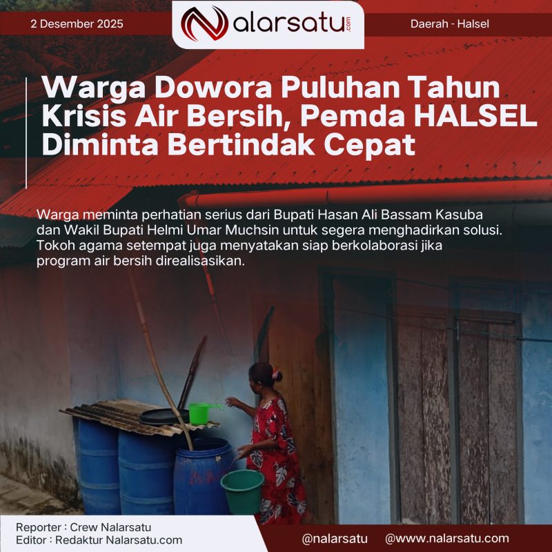 HAL-SEL, Nalarsatu.com— Warga Desa Dowora, Kecamatan Gane Barat Selatan, Halmahera Selatan, kembali mengeluhkan krisis air bersih yang telah berlangsung puluhan tahun. Hingga kini, warga hanya mengandalkan air hujan untuk kebutuhan sehari-hari.