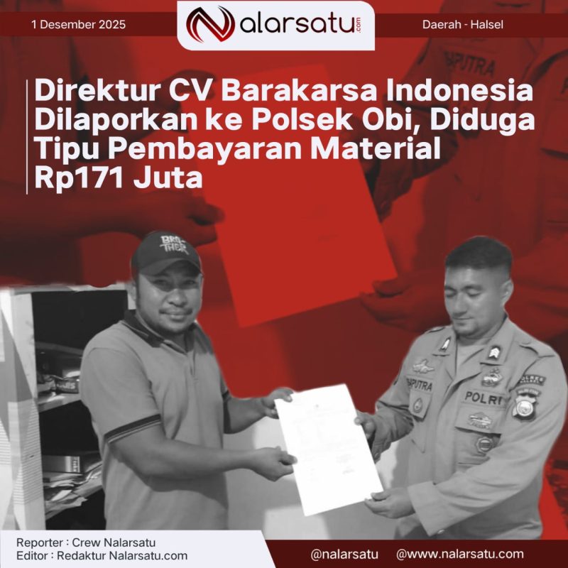 OBI, Nalarsatu.com – Dugaan penipuan dalam pembayaran material proyek kembali mencuat di Pulau Obi. Direktur CV Barakarsa Indonesia berinisial JH resmi dilaporkan ke Polsek Obi atas dugaan tidak menepati janji pembayaran material kerikil dan batu yang telah dikerjakan para sopir dan penyedia material lokal.