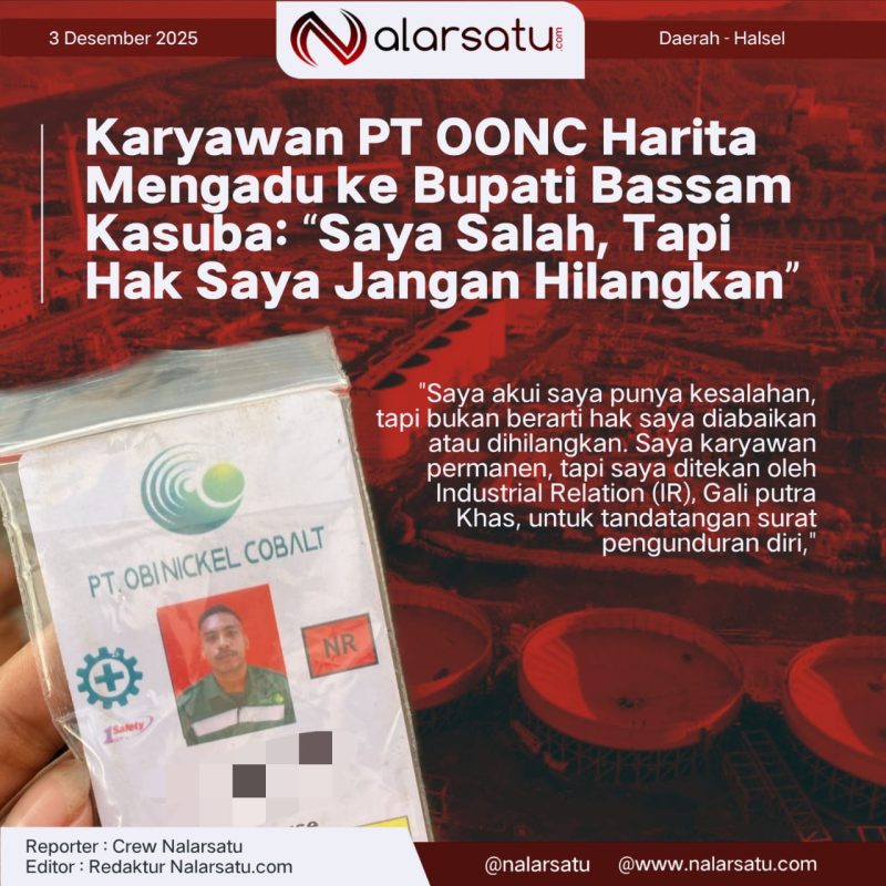 Pulau Obi, Nalarsatu.com – Seorang karyawan tetap PT OONC Obi Nickel Cobalt anak perusahaan Harita Group berinisial AS, meluapkan keluhannya melalui surat terbuka yang ditujukan kepada Bupati Halmahera Selatan Hasan Ali Bassam Kasuba dan Kepala Dinas Tenaga Kerja dan Transmigrasi (Disnakertrans) Daud Jubedi.