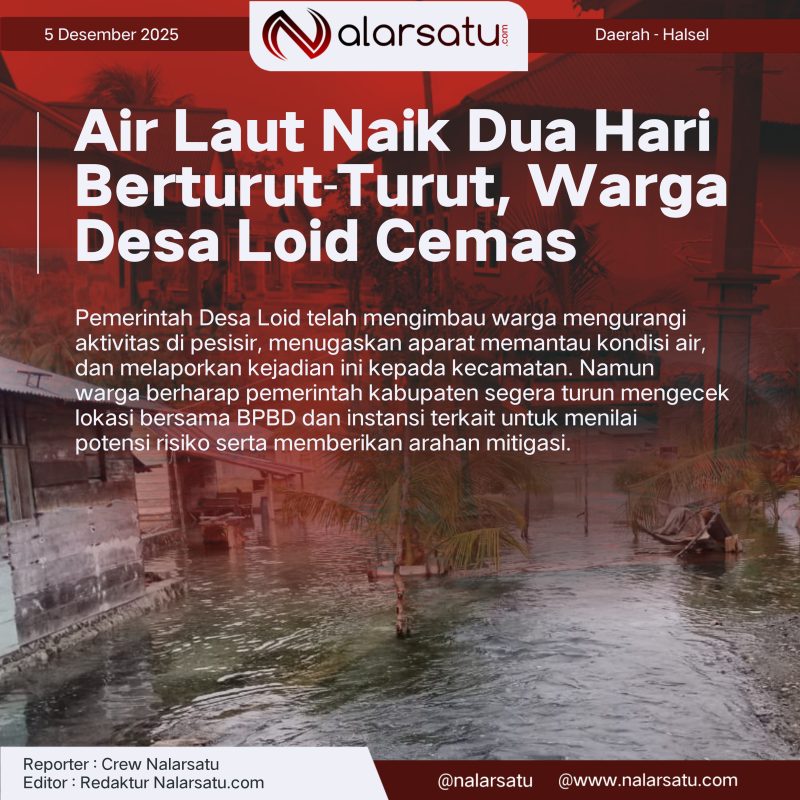 Halmahera Selatan, Nalarsatu.com – Warga Desa Loid, Kecamatan Bacan Barat Utara, dikejutkan fenomena air laut naik secara mendadak selama dua hari berturut-turut, Kamis dan Jumat. Permukaan laut tercatat meningkat sekitar 50 cm dalam waktu singkat tanpa disertai angin kencang atau hujan, sehingga memicu kecemasan masyarakat pesisir.