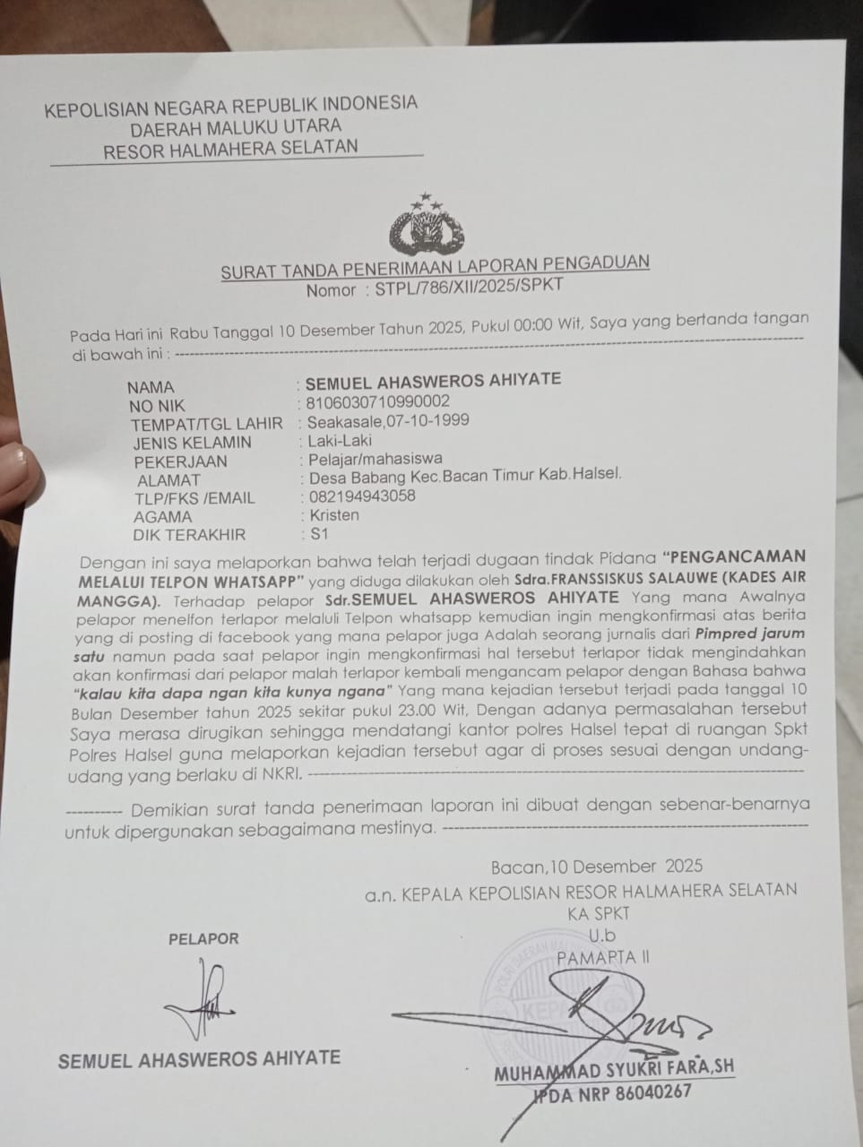 HALSEL,Nalarsatu.com – Dugaan intimidasi terhadap jurnalis kembali mencuat di Halmahera Selatan. Semuel Ahasweros Ahiyate, wartawan Jarum Satu.com, secara resmi melaporkan Kepala Desa Air Mangga, Fransiskus Salauwe, atas dugaan ancaman melalui percakapan telepon WhatsApp. Laporan ini teregisrasi nomor STPL/786/XII/2025/SPKT Polres Halmahera Selatan pada Rabu malam, 10 Desember 2025.