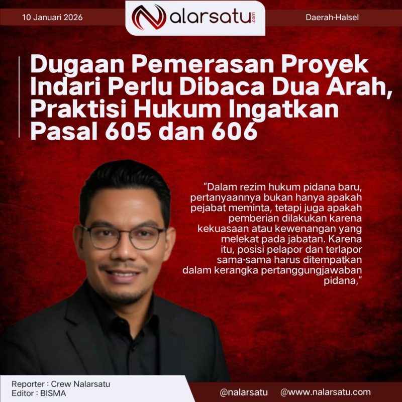 Dugaan Pemerasan Proyek Indari Perlu Dibaca Dua Arah, Praktisi Hukum Ingatkan Pasal 605 dan 606