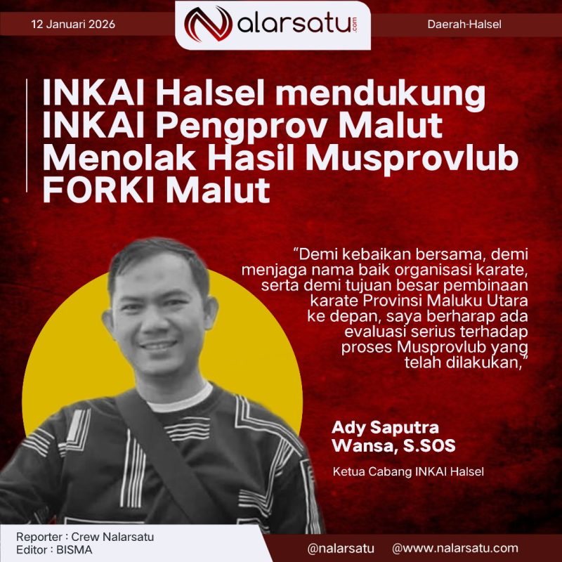 Halsel, Nalarsatu.com – Polemik pelaksanaan Musyawarah Provinsi Luar Biasa (Musprovlub) Federasi Olahraga Karate-Do Indonesia (FORKI) Provinsi Maluku Utara terus menuai penolakan. Ketua Pengurus Cabang (Pengcab) INKAI Kabupaten Halmahera Selatan secara tegas menyatakan menolak hasil Musprovlub FORKI Malut, yang dilaksanakan pada 20 November 2025 di Ternate.