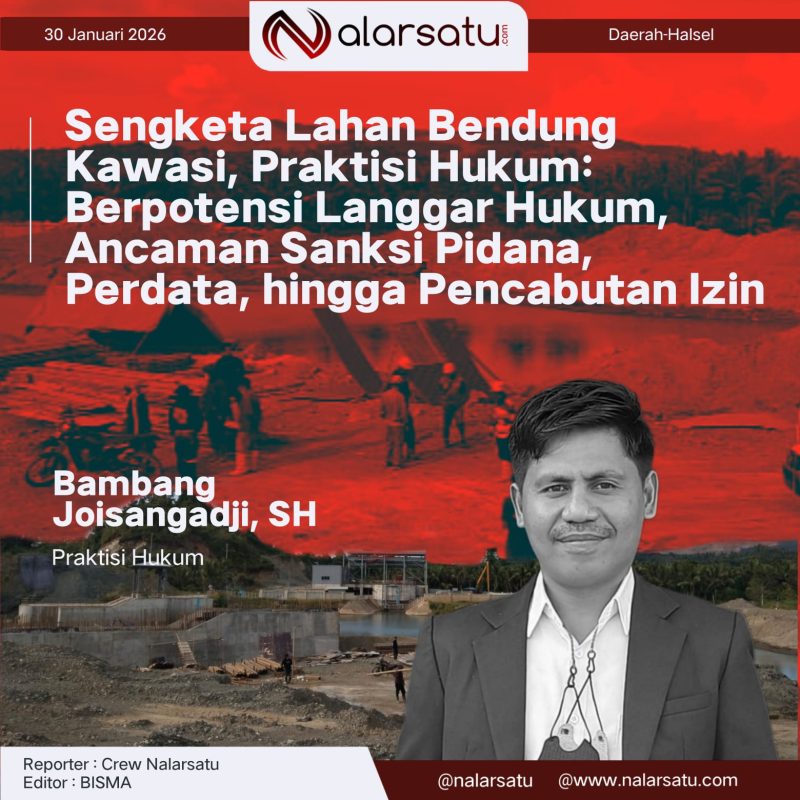 Halmahera Selatan, Nalarsatu.com – Sengketa lahan pembangunan bendung di Desa Kawasi, Kilo 4 Sungai Akelamo, Pulau Obi, Kabupaten Halmahera Selatan, dinilai telah memasuki ranah pelanggaran hukum serius. Aktivitas pembangunan bendung yang dilakukan di atas lahan warga yang belum dibebaskan secara sah berpotensi menimbulkan konsekuensi hukum berlapis, mulai dari pidana, perdata, hingga sanksi administratif berupa pencabutan izin.