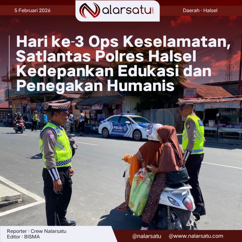 HALSEL, Nalarsatu.com – Memasuki hari ketiga pelaksanaan Operasi Keselamatan Lalu Lintas, Satuan Lalu Lintas (Satlantas) Polres Halmahera Selatan (Halsel) terus mengintensifkan upaya preemtif, preventif, serta penegakan hukum secara humanis di seluruh wilayah hukumnya.