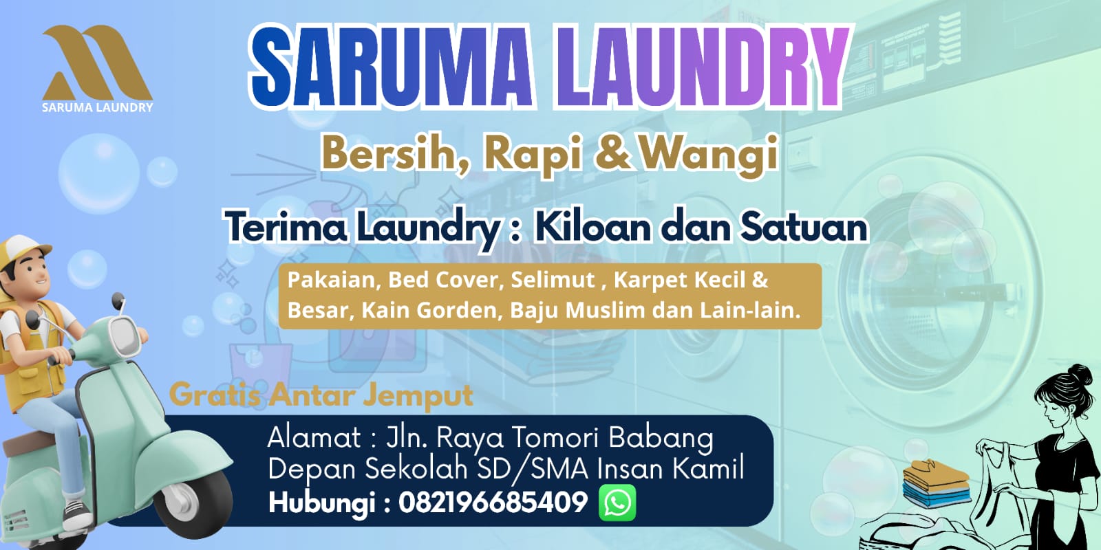 Berlokasi strategis di Jalan Raya Tomori–Babang, tepat di depan kompleks sekolah TK–SMA Insan Kamil, Saruma Laundry hadir menjawab kebutuhan masyarakat perkotaan yang semakin dinamis, terutama bagi pekerja, mahasiswa, dan keluarga yang memiliki aktivitas padat.