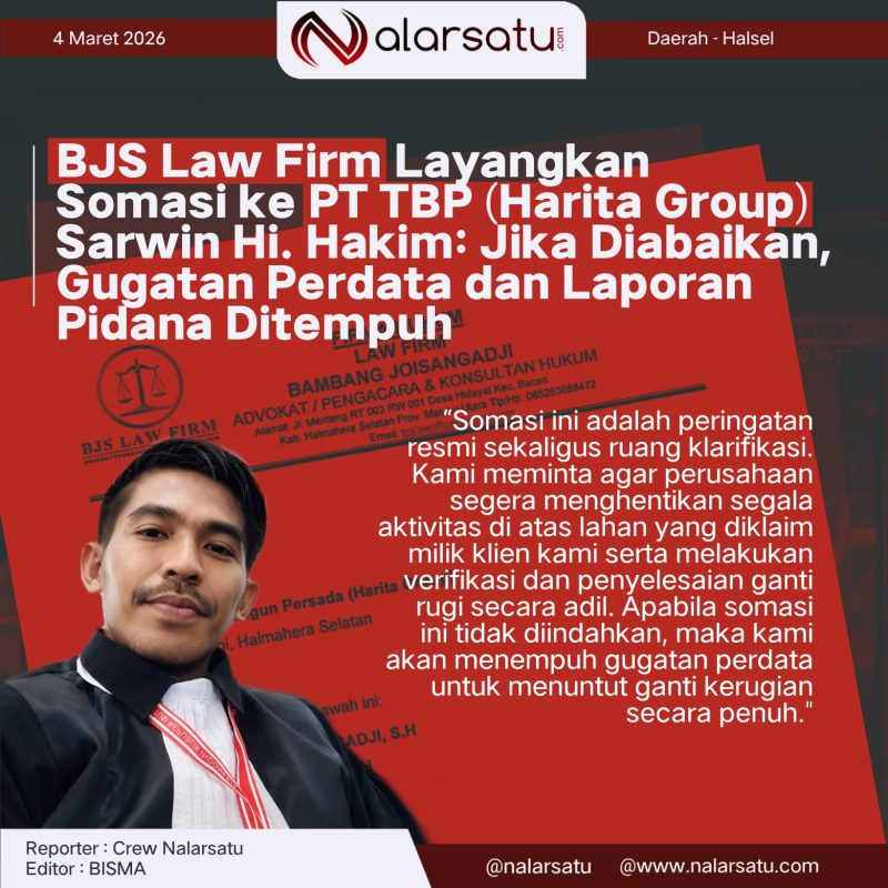 BJS Law Firm Layangkan Somasi ke PT TBP (Harita Group), Sarwin Hi. Hakim: Jika Diabaikan, Gugatan Perdata dan Laporan Pidana Ditempuh