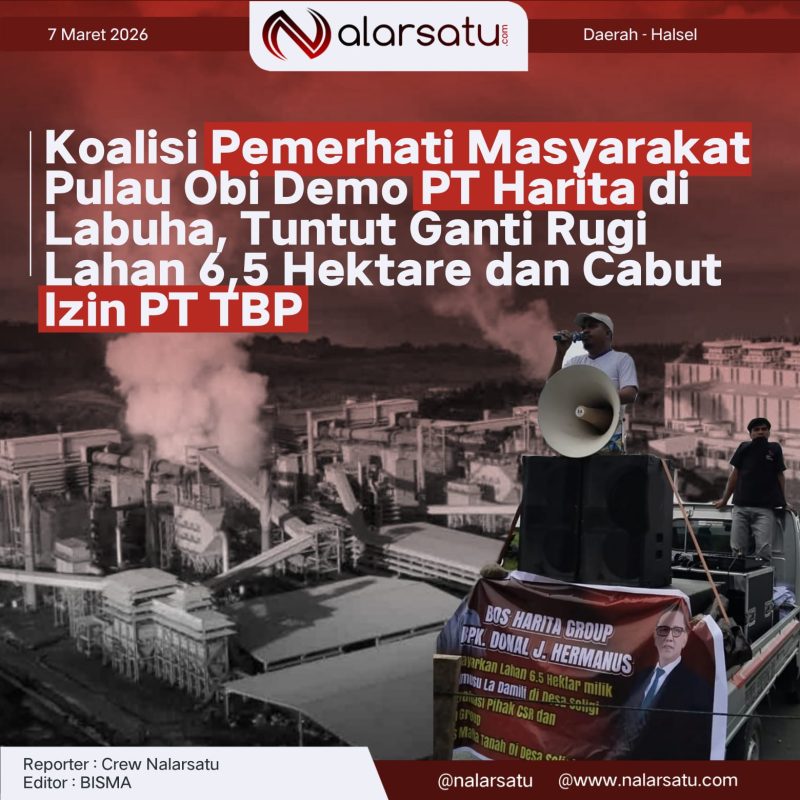 LABUHA, Nalarsatu.com – Koalisi Pemerhati Masyarakat Pulau Obi menggelar aksi demonstrasi di depan Kantor PT Harita Group di Labuha, Kabupaten Halmahera Selatan, Maluku Utara. Aksi tersebut dilakukan sebagai bentuk protes atas dugaan penyerobotan lahan kebun milik warga Desa Soligi, Kecamatan Obi Selatan.