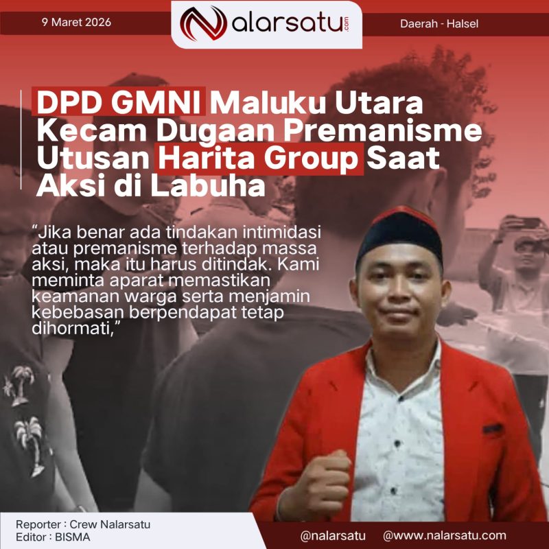 Labuha,Nalarsatu.com – Dewan Pimpinan Daerah (DPD) Gerakan Mahasiswa Nasional Indonesia (GMNI) Maluku Utara mengecam keras dugaan tindakan premanisme yang dilakukan oleh utusan perusahaan PT Harita Group terhadap massa aksi demonstrasi yang digelar Koalisi Pemerhati Masyarakat Pulau Obi di depan kantor perusahaan tersebut di Labuha, Kabupaten Halmahera Selatan.