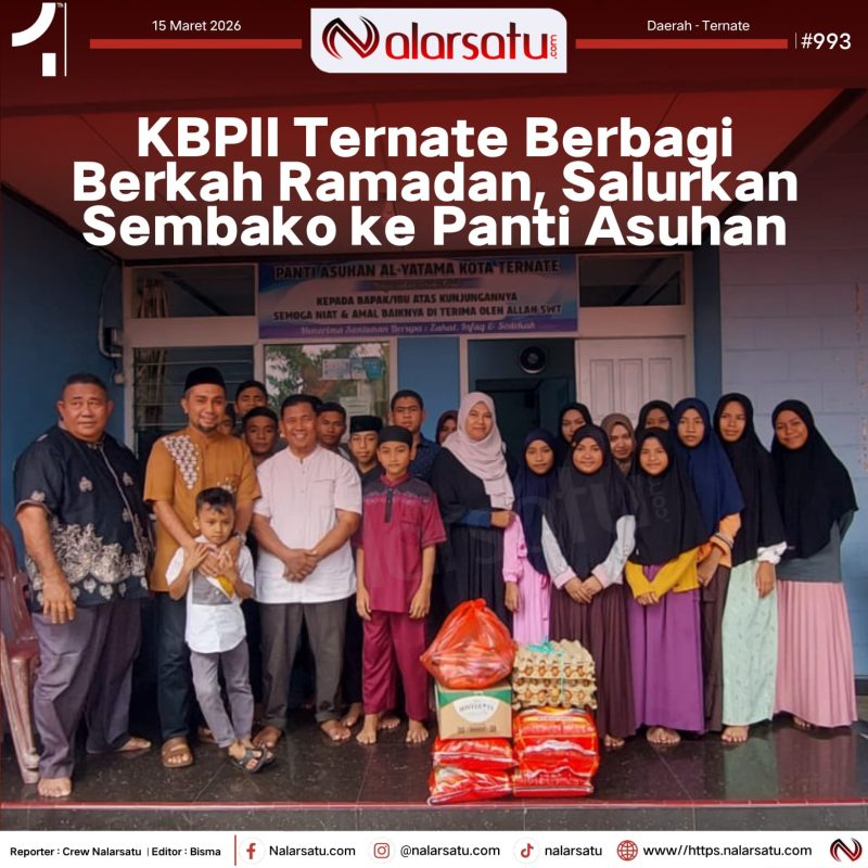 Ternate,Nalarsatu.com – Dewan Pimpinan Daerah Keluarga Besar Pelajar Islam Indonesia (DPD KBPII) Kota Ternate menggelar kegiatan berbagi berkah Ramadan dengan menyalurkan bantuan sembako kepada dua panti asuhan di Kota Ternate, Jumat (13/3/2026).