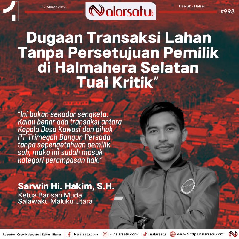 “Ini bukan sekadar sengketa. Kalau benar ada transaksi antara Kepala Desa Kawasi dan pihak PT Trimegah Bangun Persada tanpa sepengetahuan pemilik sah, maka ini sudah masuk kategori perampasan hak,” tegas Sarwin.