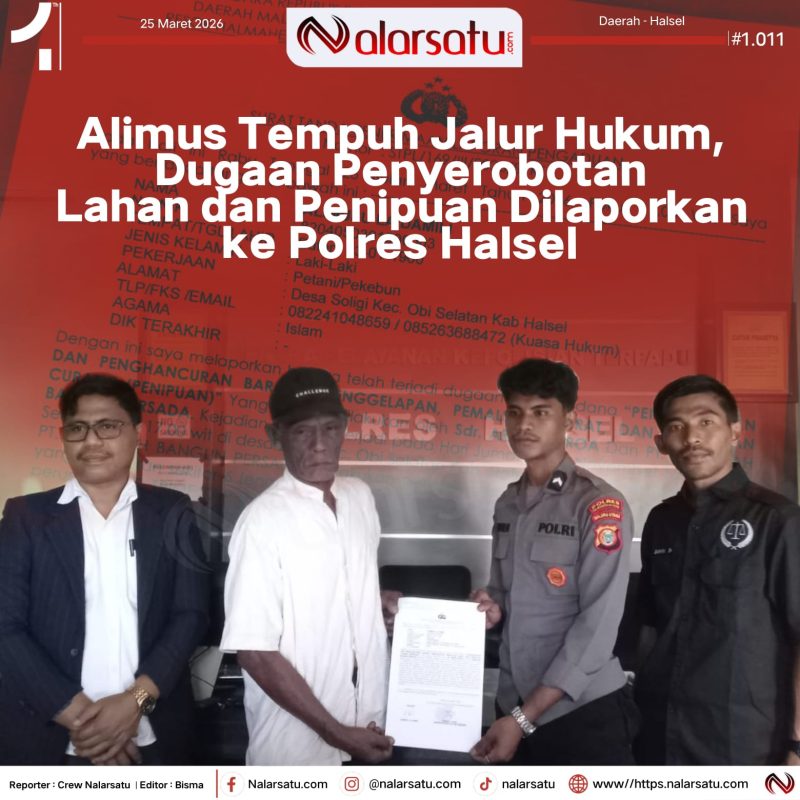 Halmahera Selatan,Nalarsatu.com – Kuasa hukum Sarwin Hi. Hakim, S.H dari BJS Law Firm resmi melaporkan dugaan tindak pidana ke Polres Halmahera Selatan dengan nomor STPL/169/III/2026/SPKT pada Rabu, 25 Maret 2026. Laporan tersebut diajukan atas nama kliennya, Alimusu La Damili, terkait dugaan pengrusakan, penghancuran barang, penggelapan, pemalsuan surat, serta perbuatan curang atau penipuan.