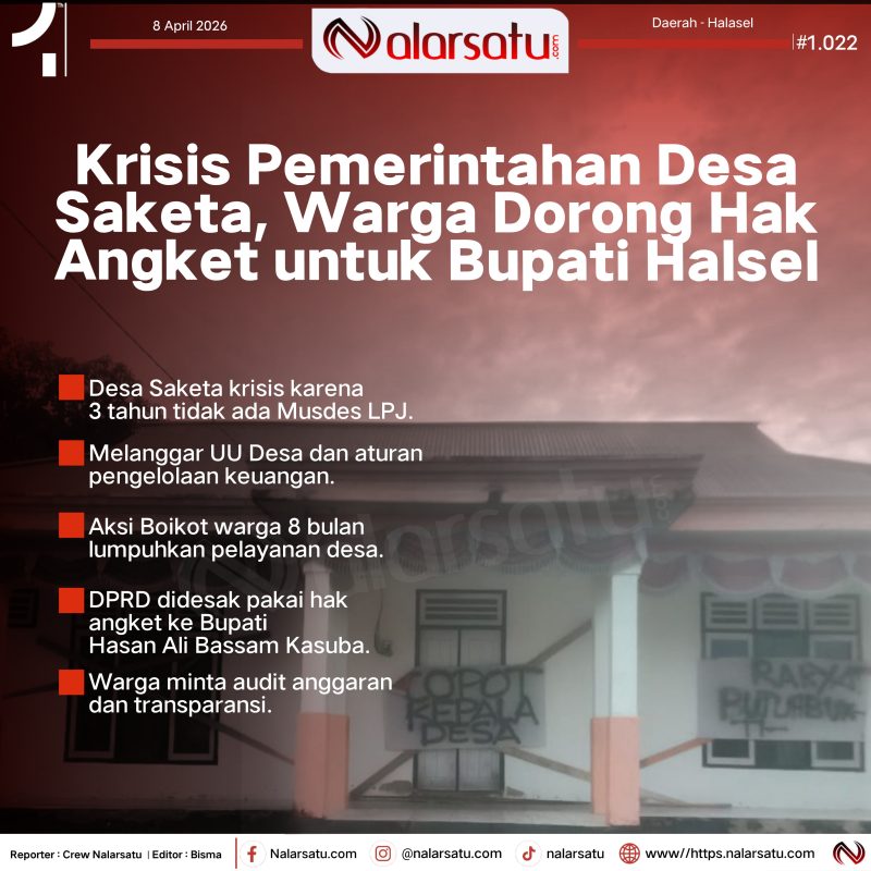 Halsel, Nalarsatu.com – Situasi pemerintahan di Desa Saketa, Kecamatan Gane Barat, Kabupaten Halmahera Selatan, kian memanas. Koordinator Aliansi Masyarakat Saketa, Ismail, menegaskan bahwa kondisi tersebut telah memasuki tahap krisis serius akibat tidak dilaksanakannya Musyawarah Desa (Musdes) Laporan Pertanggungjawaban (LPJ) selama tiga tahun berturut-turut, sejak 2023 hingga 2025.