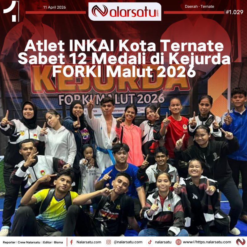 Ternate, Nalarsatu.com — Prestasi membanggakan ditorehkan para atlet Institut Karate-Do Indonesia (INKAI) Kota Ternate dalam ajang Kejurda FORKI Malut 2026 yang digelar pada 11–12 April 2026 di Ternate. Dalam kejuaraan tersebut, kontingen INKAI Kota Ternate berhasil meraih total 12 medali, terdiri dari 6 emas, 4 perak, dan 2 perunggu.
